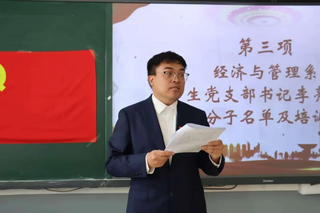 为深入学习贯彻习近平新时代中国特色社会主义思想和党的二十大精神,切实加强对入党积极分子的培养教育,严把党员发展“入口关”,10月28日,经济与管理系举行2025年下半年入党积极分子培训班开班仪式。系党委书记韩军雁、学生党支部书记李亮、专职组织员石锰奇出席,2025年下半年全体入党积极分子参加。李宇杰主持。