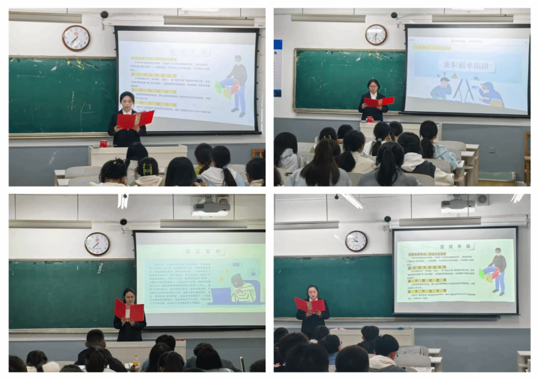 团委宣传部“经语青听”宣讲团在104、105、109教室开展了“钱袋子守护计划”主题宣讲。宣讲聚焦大学生群体常见的金融诈骗案例,深入剖析骗局手法,并传授实用的防范措施。活动有效提升了同学们的金融安全意识,让防骗知识深入人心,助力大家筑牢财产安全防线,担当起新时代青年的应有之责。