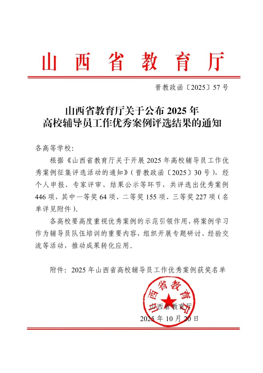 近日,山西省教育厅公布了2025年高校辅导员工作优秀案例征集评选结果,我系辅导员团队再创佳绩,凭借其扎实的一线工作基础和富有创新性的实践探索,荣获二等奖两项、三等奖一项。其中,芦宇婕撰写的《冲破考公迷雾 重书职业华章》、李亮撰写的《“筑砺”赋能:从“输血”到“造血”—— 一位学业困难受助生的成长蜕变与工作室育人模式探索》双双荣获二等奖;白凤麟撰写的《自媒体时代学生直播维权:辅导员的化解之道》荣获三等奖。