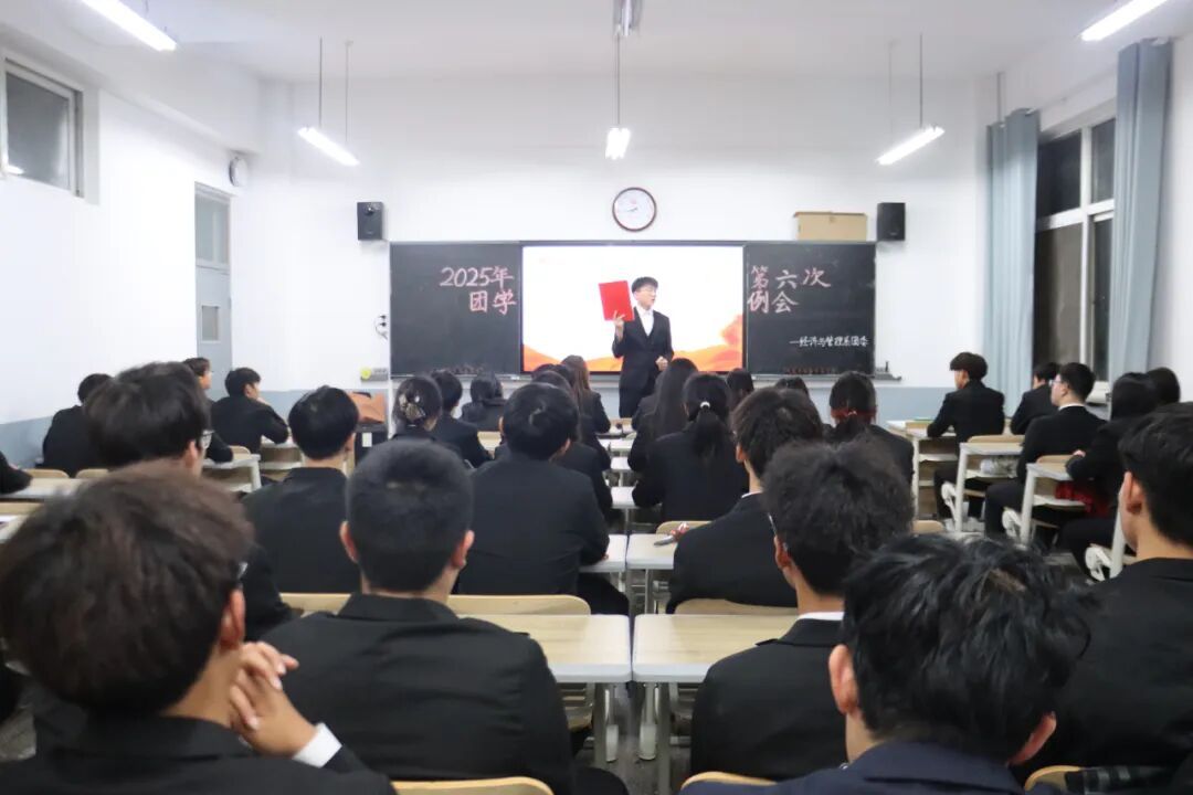 为深入学习贯彻习近平新时代中国特色社会主义思想,认真落实校团委关于学生组织建设的各项要求,扎实推进我系团学工作高质量发展,10月31日,经济与管理系团委组织召开2025年第六次团学工作例会。主席团成员、各部门负责人及干事代表参会。会议由系学生会执行主席王凡凡主持。